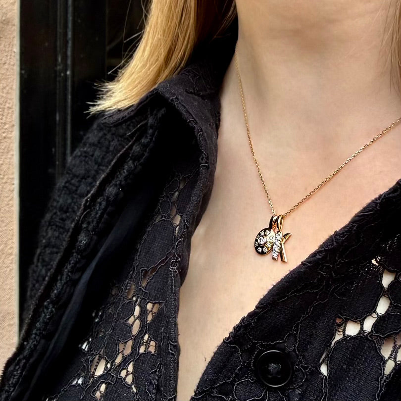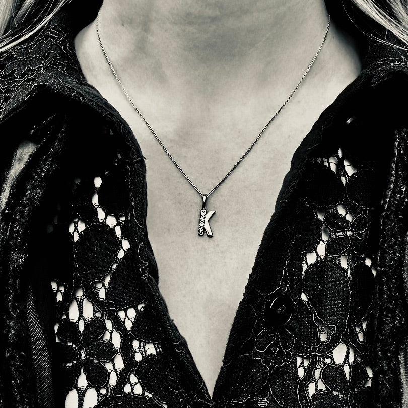 The diamond-set letter K pendant - not big, not small - just a super everyday-wear size, a slightly noisy-to-be-noted and luxurious note from the 3 large 2mm/0,03ct brilliant cut diamonds, untraditionally center set on only the long smooth letter-side.