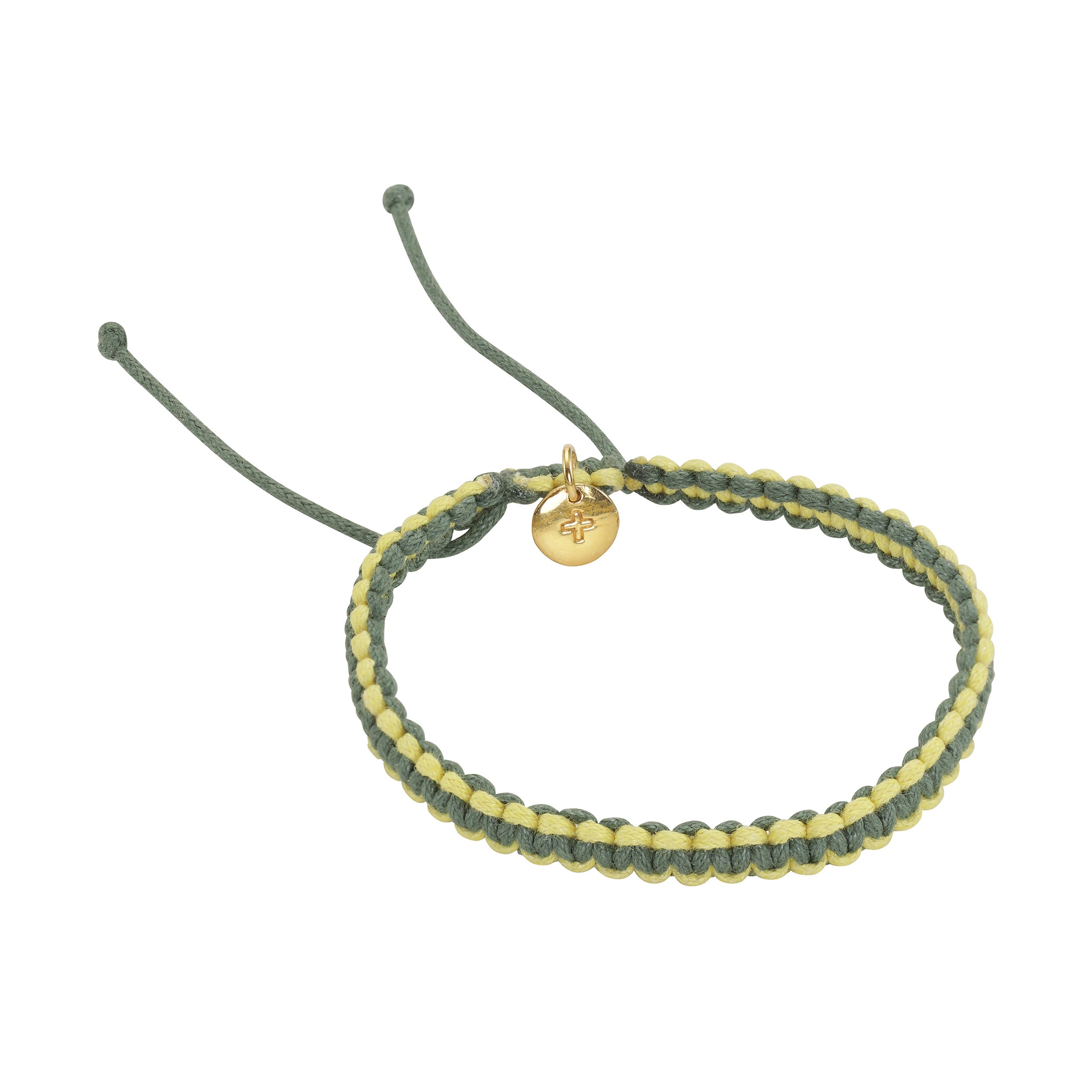 Super cool braided versatile yellow/army bracelet, decorated with a tiny glossy gold tag.