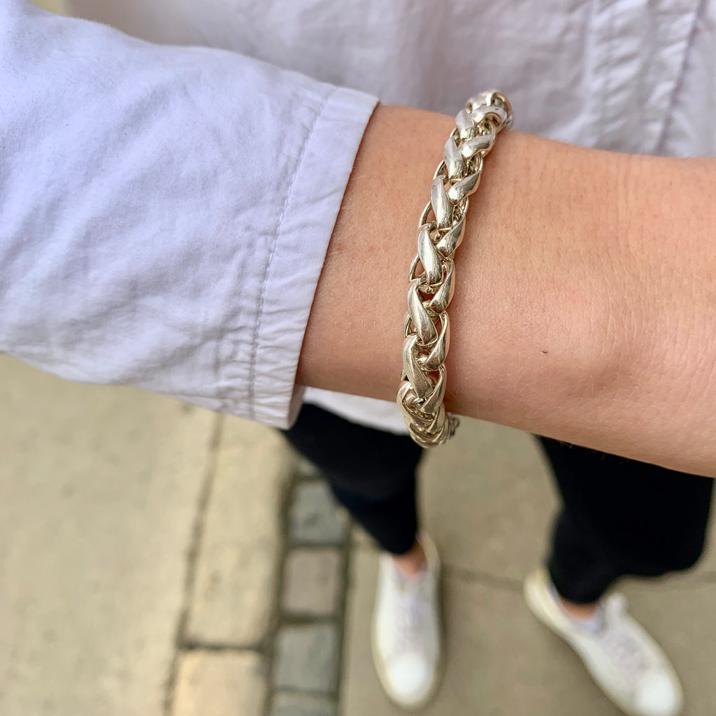 The smooth Robe bracelet - large sized - in silver twirled links. Let it shine alone or mix and match with other styles for a chunky cool look.