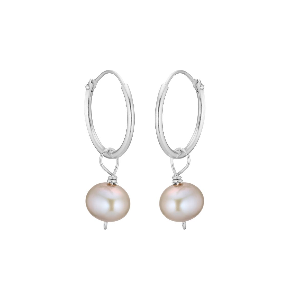 15mm crispy silver hoops set with a rounded nude-brownish pearl.