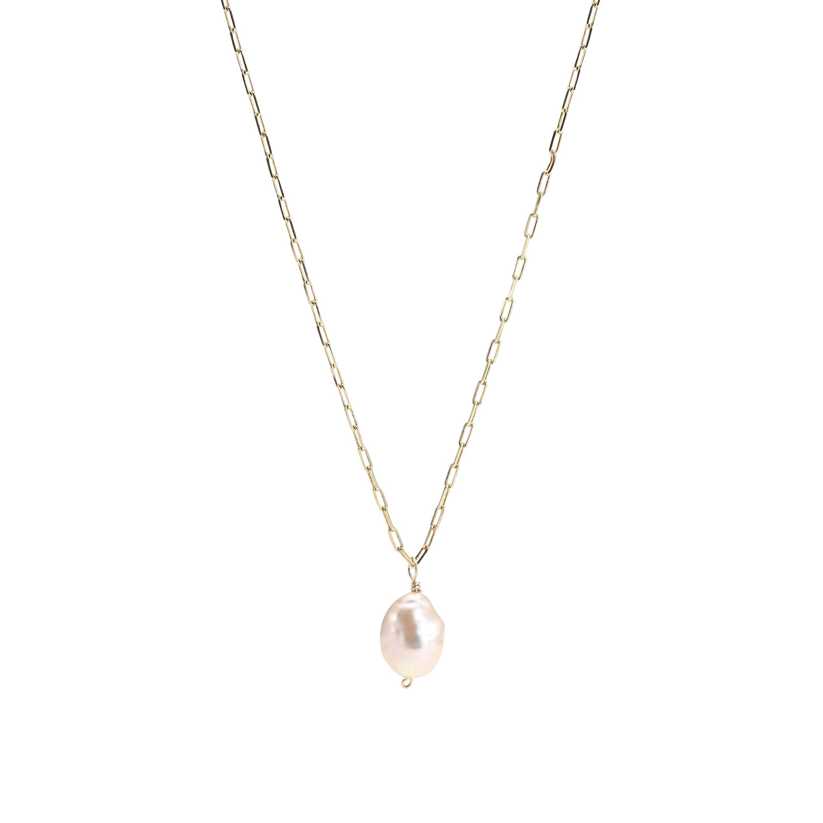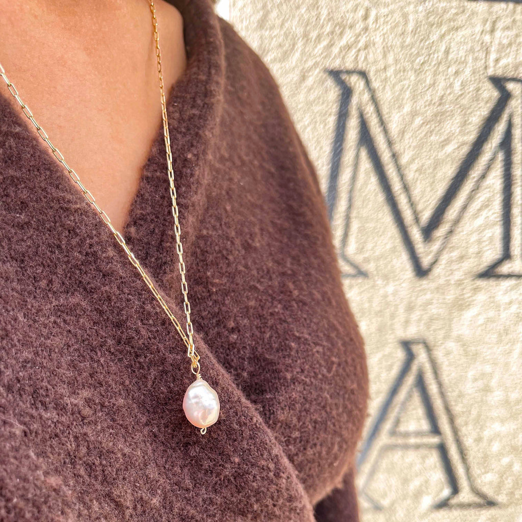 Delicious large, rosy pearl set in a longer 60cm cool mini-link chain.