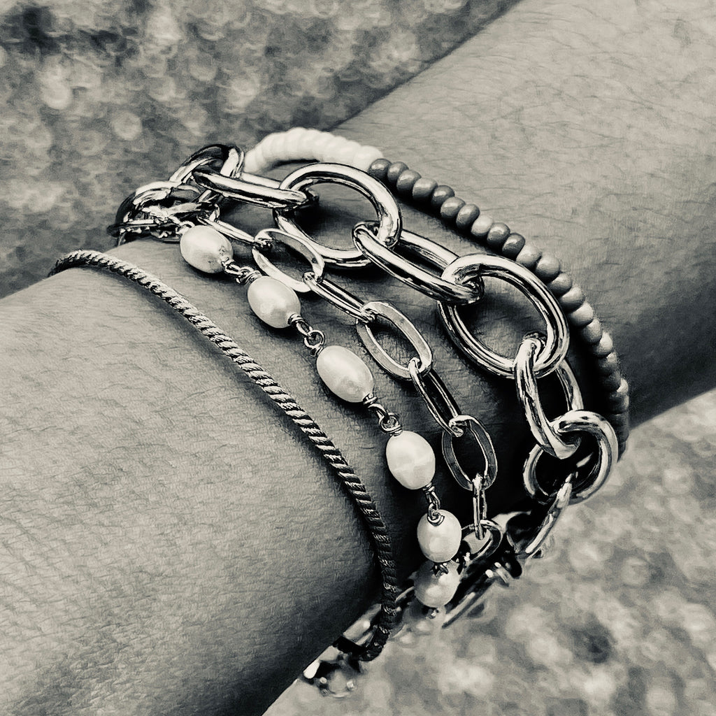 The Fira bracelet is made of colorfull beads, - 2/3 bright yellow and 1/3 creamy beads to crispy silver details.