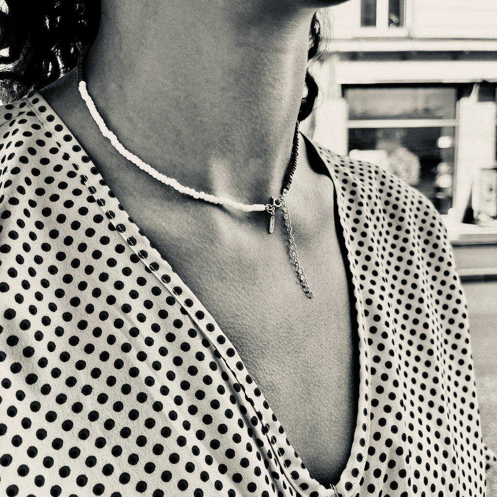 The Oia necklace, made-to-make-you happy, is colorfull beads and crispy silver: 2/3 red and 1/3 creamy beads. Wear single or go summer-stacking-up with other necklaces