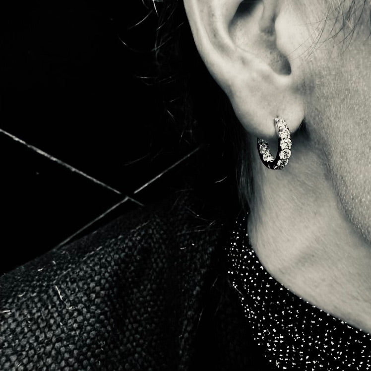Set with 3mm/0,11 ct diamonds, this style comes out r e a l l y sparkly, yet on a calm everyday-wear note as size is 16mm. To hold the large diamonds, this huggie is wide, with certain depth as well, so - a super cool chunky, elegant note.