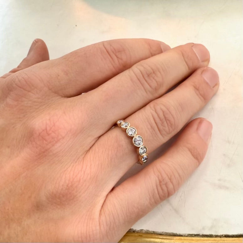 The classic even, graduated Bezel ring, a larger 5mm center graduated down to 2,6mm on the side. Well made, a fine crafted style.